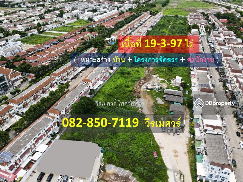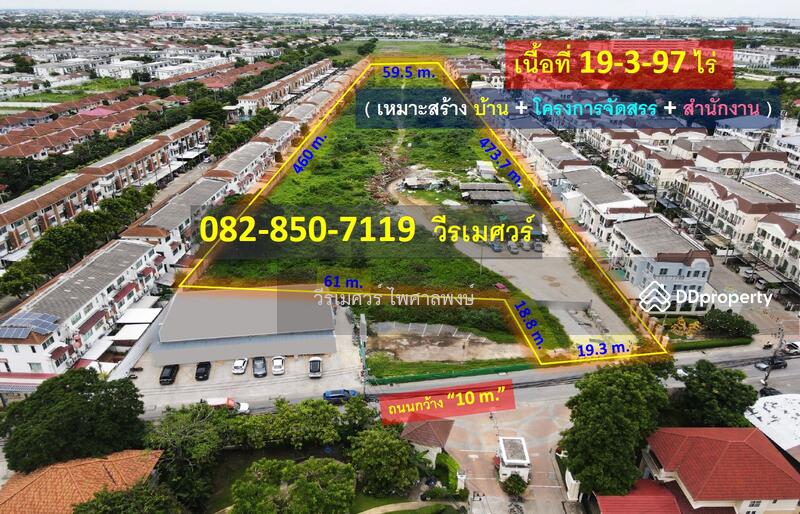 ขายที่ดิน ถนนศรีนครินทร์-ร่มเกล้า (เหมาะสร้างบ้าน + โครงการจัดสรร + สำนักงาน) 19-3-97 ไร่ รูปคล้ายสี่เหลี่ยมผืนผ้าสวยงาม ผิวสัมผัสถนน 19.3 เมตร ถนนกว้าง 10 เมตร