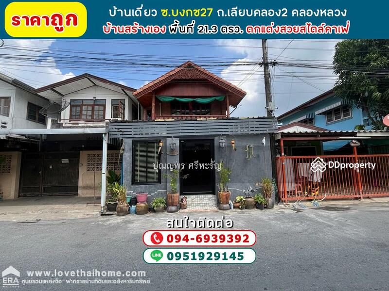 ขายบ้านเดี่ยว ซอยบงกช27 ถนนเลียบคลอง2 คลองหลวง ในเคหะฟื้นนคร พื้นที่ 21.3 ตรว. บ้านสร้างเอง ตกแต่งสไตล์คาเฟ่ แบบธรรมชาติ ดูหรู ราคาแพง แต่ราคาจริงๆ ถูกกว่าที่คิด