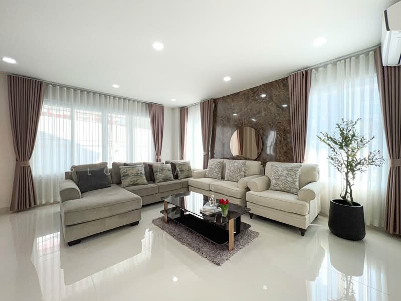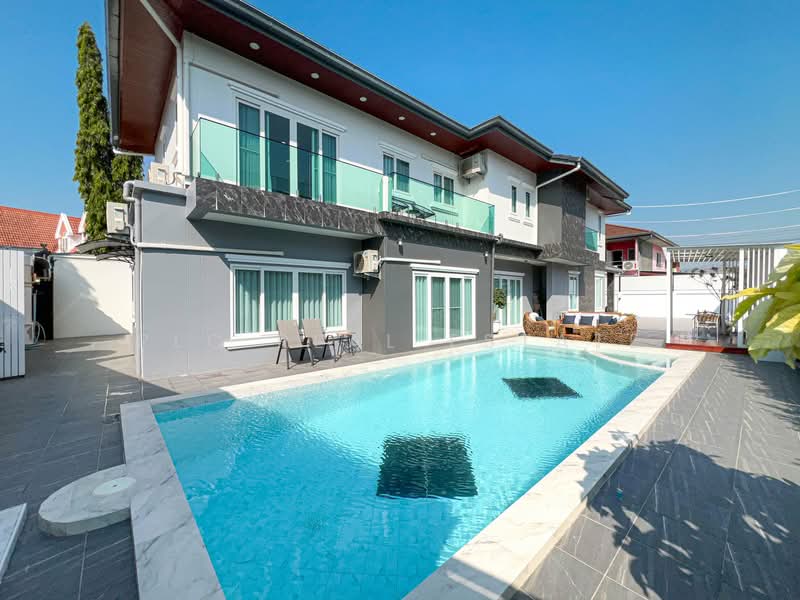 The villa sits on 131 sq.wah (524 sq.m) of land and provides 450 sq.m of usable space. In addition, the layout includes 4 bedrooms, 4 bathrooms, and 1 multipurpose room, which supports flexible family living. Furthermore, the home features both a Thai kitchen and a European kitchen for practical daily use and entertaining. The private 4×10 meter saltwater swimming pool enhances outdoor relaxation, while built-in furniture throughout allows immediate move-in. Consequently, this spacious residence offers comfort, functionality, and long-term value with no common area fees.