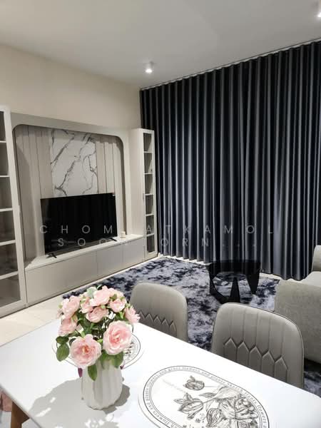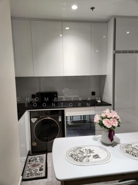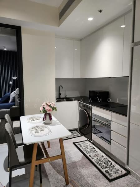 This modern 1 bedroom, 1 bathroom condo offers 49.3 square meters of stylish city living on the 20th floor of Tait 12 in Si Lom, Bang Rak, Bangkok. The fully furnished interior presents a clean, contemporary design with an open-plan layout and practical built-in elements.