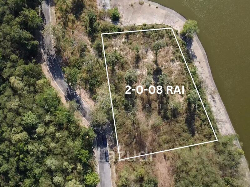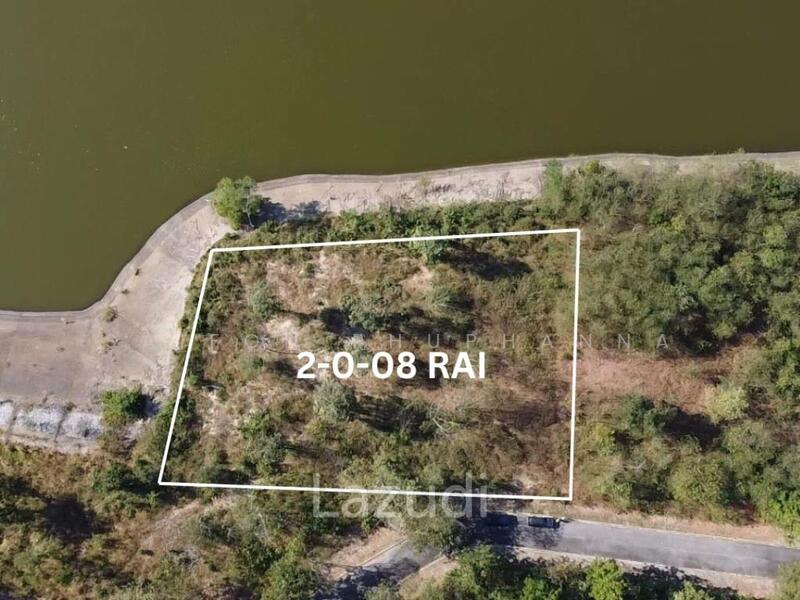 The main features include an irregular but clearly defined lot with a size of 2-0-08 rai, equal to approximately 3,232 square meters. The land is currently vacant and undeveloped with natural vegetation and partial tree cover. The plot enjoys direct frontage to a large lake or reservoir, creating an appealing lakeside setting. Road access is available from an adjacent paved road, giving practical entry to the site.