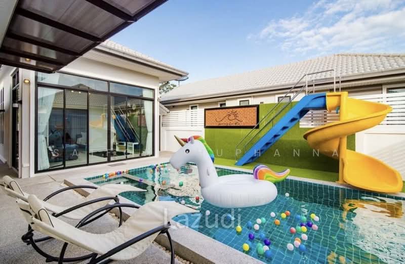 This single-storey villa offers a bright, modern living environment with direct access to a private swimming pool. The property provides a family-friendly atmosphere with playful outdoor spaces and comfortable interiors on a 280 sqm freehold land plot in Hin Lek Fai, Hua Hin.
