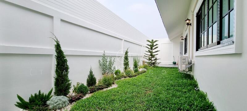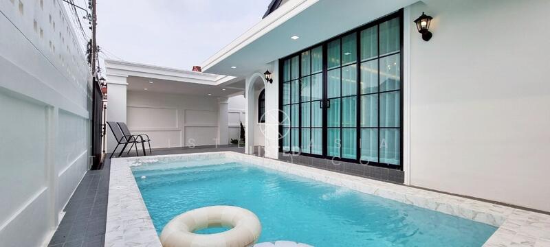 This 3-bedroom, 2-bathroom pool villa is situated on a land plot of 224 SQM The house is designed in a unique English Cottage style. The open ceiling adds a sense of comfort and spaciousness to the interior space. The design perfectly combines modernity with the warmth of the English style. The villa is fully furnished with modern appliances, combining comfort and luxury perfectly. The villa has 3 air conditioners. The living room is spacious and airy, decorated with modern furniture. Large windows allow natural light to enter, making the room bright and warm. The spacious lawn area is covered with bright green artificial grass for sitting and relaxing and enjoying the view around the house. The 3×6 meter swimming pool is located in the private area of the villa, providing ample space for swimming and relaxing. The pool area has outdoor seating areas, making it an ideal place to relax and socialize with family and friends. The villa is designed for convenience, with Thai kitchen, equipped with gas stove, range hood, refrigerator, microwave, large refrigerator, 4-seater dining table and plenty of storage space. The spacious living and dining area creates a warm and inviting atmosphere, ideal for relaxing and socializing. The covered parking area can accommodate 1 car, with newly tiled areas around the garage.