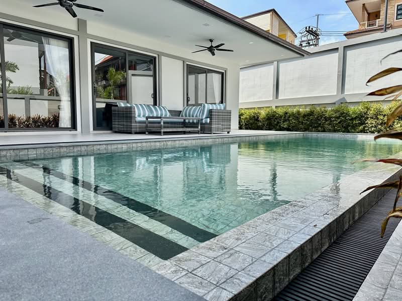The villa features 4 bedrooms and 5 bathrooms on 81 sq.wah of land with 250 sq.m of usable space. In addition, the layout includes a welcoming living room and a fully equipped European kitchen with washing machine, while a separate Thai kitchen is located outside for practical cooking. Furthermore, the private saltwater swimming pool (10 x 3.6 meters) creates a refreshing outdoor highlight. The landscaped garden, covered parking area, and outdoor seating zone with TV further enhance the lifestyle appeal. Consequently, this property delivers complete functionality for modern family living.