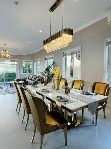 This property features a land size of 725 Sqm. and a usable area of 500 Sqm. The villa comes fully furnished, with an open-plan living area, dining table, built-in European kitchen, en-suite bathrooms, swimming pool, and car park.