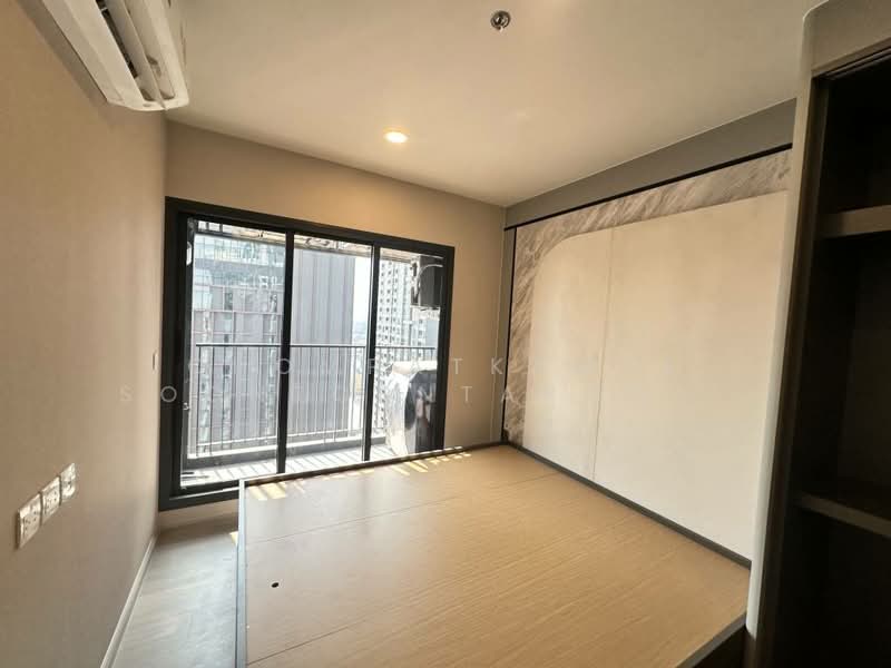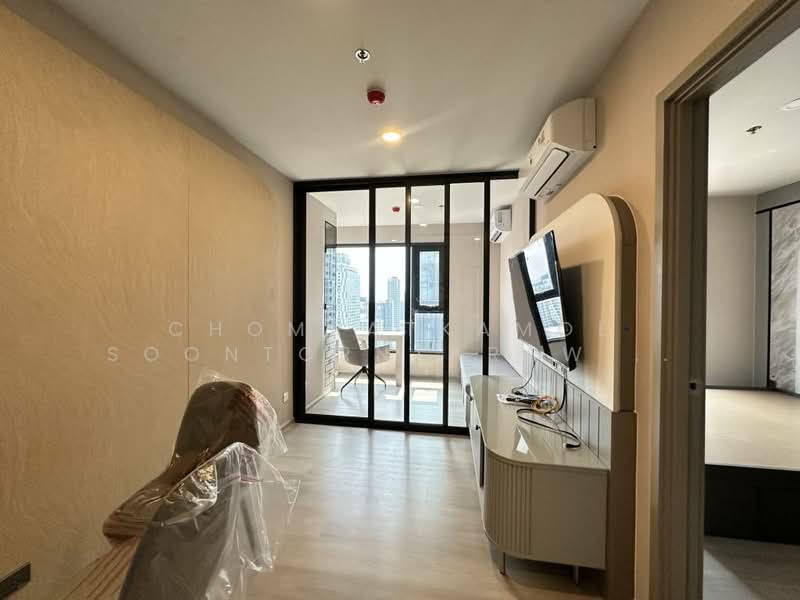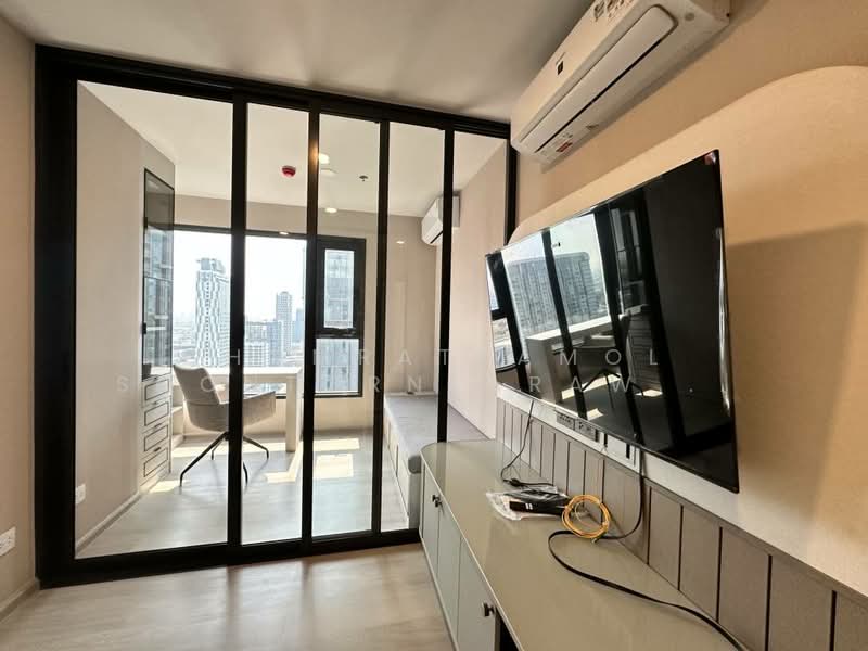 This modern one-bedroom condo offers a bright living space on the 30th floor of Aspire Onnut Station in Bang Chak, Prakanong, Bangkok. The interior measures 35 square meters and presents a contemporary layout with strong natural light and wide city skyline views.