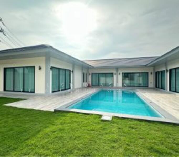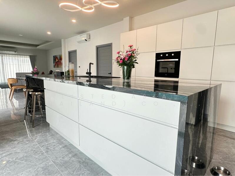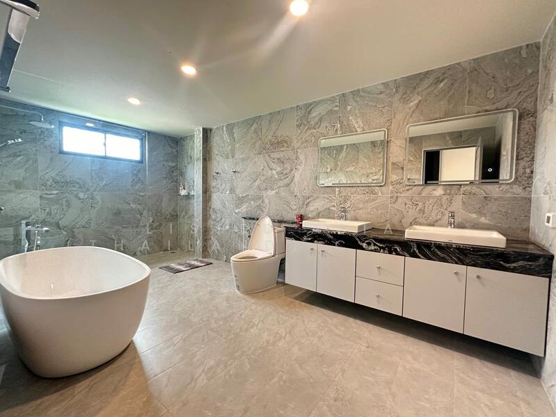 Pool Villa for Sale in Huay Yai!! set on a 856 sqm land plot size with a 450 sqm usable area, features 4 bedrooms with en-suite bathrooms and a total of 5 bathrooms. The master bedroom includes a modern bathtub, while the other bathrooms are fitted with high-quality fixtures. Highlights include a private 3.5×9-meter swimming pool with modern tiles, a landscaped garden, and interiors adorned with wallpaper and solid teak wood doors. The European and Thai kitchens complement the elegant design. With 2.2-meter-high walls ensuring privacy and parking for up to 7 cars, this villa offers a perfect blend of luxury, style, and comfort.