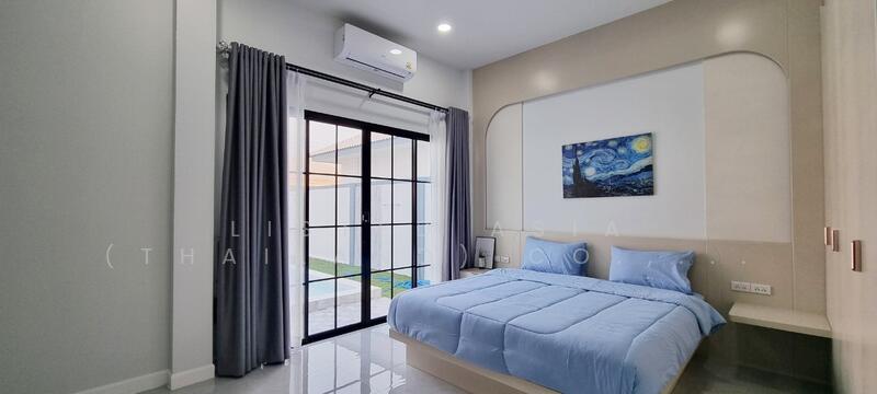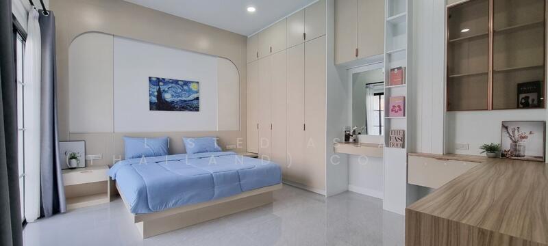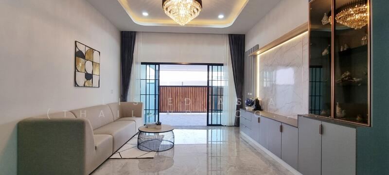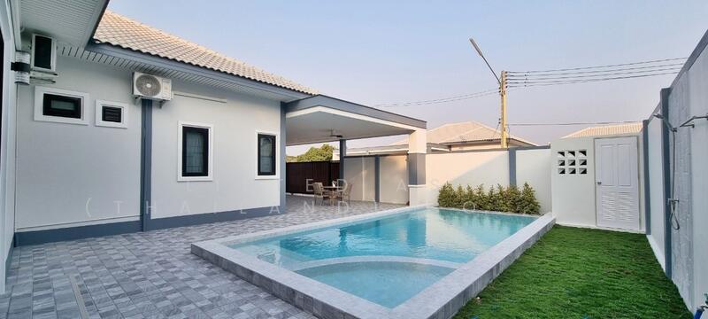 Set on a 386.4 sqm. land plot with approximately 200 sqm. of usable space The villa comes with built-in furniture and a fully equipped European-style kitchen, ideal for cooking and entertaining. The living room features a stylish TV wall decoration, and the home is fitted with curtains for added privacy and comfort. Additional features include a tiled garage, a water tank, and a pump for convenience. This spacious pool villa offers a private pool and a well-designed layout for comfortable living.