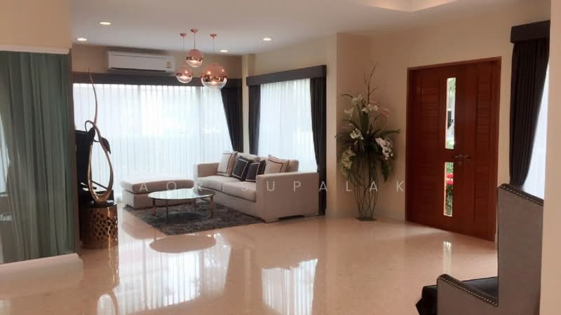 The outdoor space is equally impressive, offering a spacious garden where you can enjoy Bangkok's pleasant weather, host gatherings, or simply relax in peace. The property is located in a secure, gated community with 24-hour security, ensuring both comfort and peace of mind.