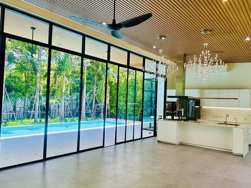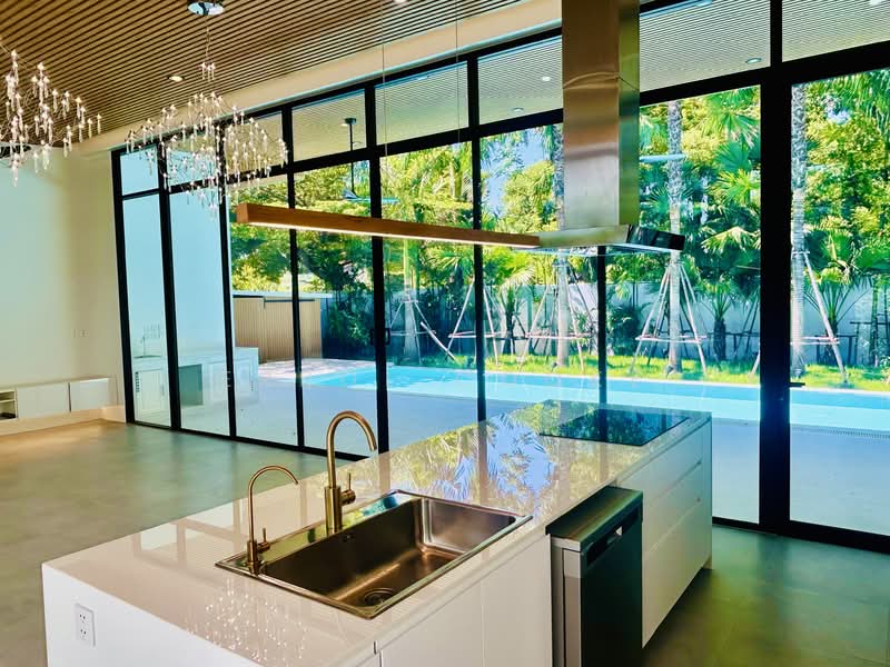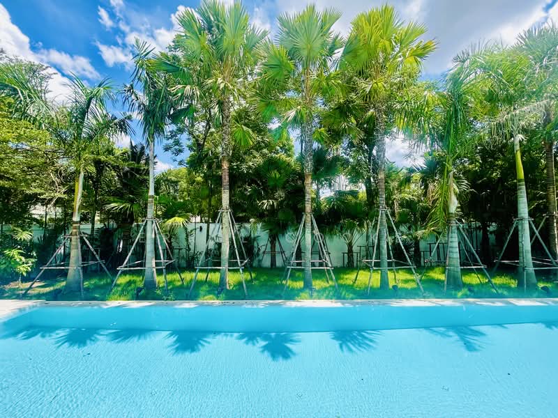 Set on a prime corner plot opposite the estate park, this never-lived-in modern pool villa delivers refined indoor–outdoor living in one of Chaeng Wattana's most private and sought-after residential enclaves.