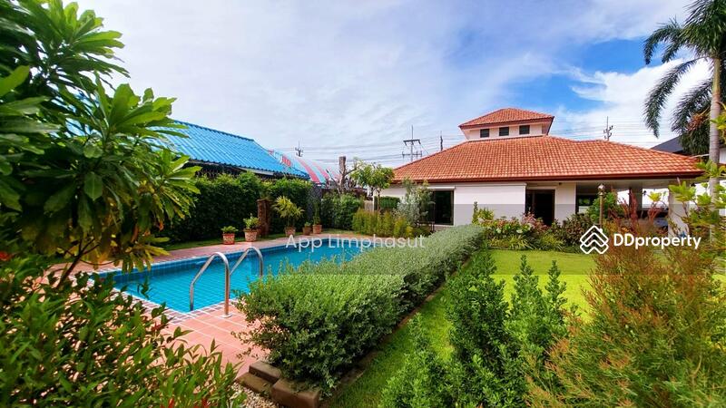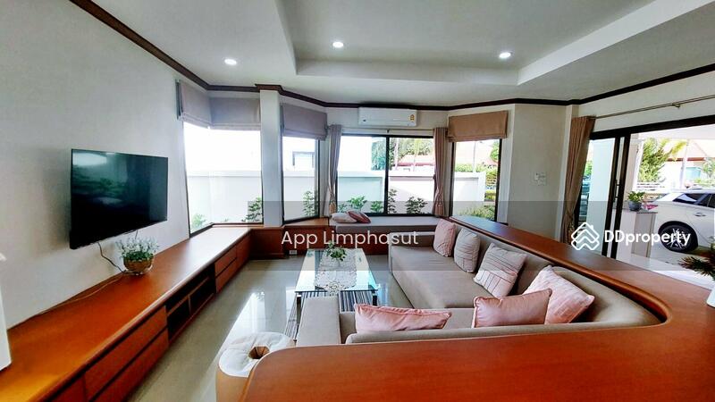 This is 3 Bedrooms, 3 Bathrooms House for Sale in East Pattaya. Sitting on 640 sqm of land plot size, 300 of usable area, comes fully furnished, built-in European kitchen, electric hob, electric oven, refrigerator, microwave, washing machine, dining table, open plan living area with comfortable sofa & flat screen TV, built-in cabinet, built-in wardrobe, en-suite bathroom with bath tub, private swimming pool, spacious garden, sizeable patio and covered car park.