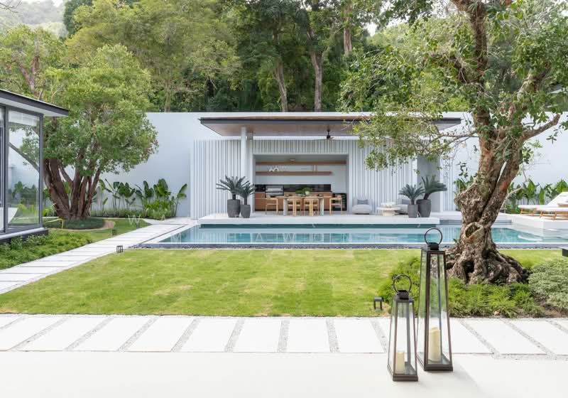 The open-plan layout invites abundant natural light, seamlessly connecting the living, dining, and kitchen areas to a private outdoor terrace and pool. Floor-to-ceiling windows frame lush greenery, creating a calming atmosphere where indoor and outdoor living blend effortlessly. The contemporary kitchen is equipped with premium appliances and stylish finishes, ideal for both everyday meals and entertaining guests.