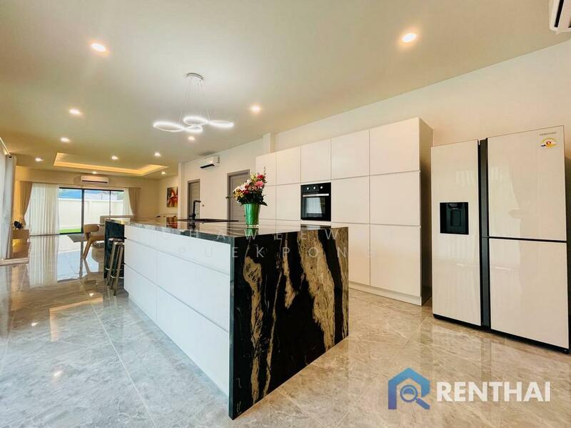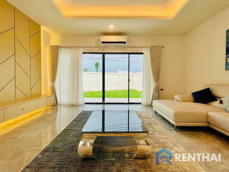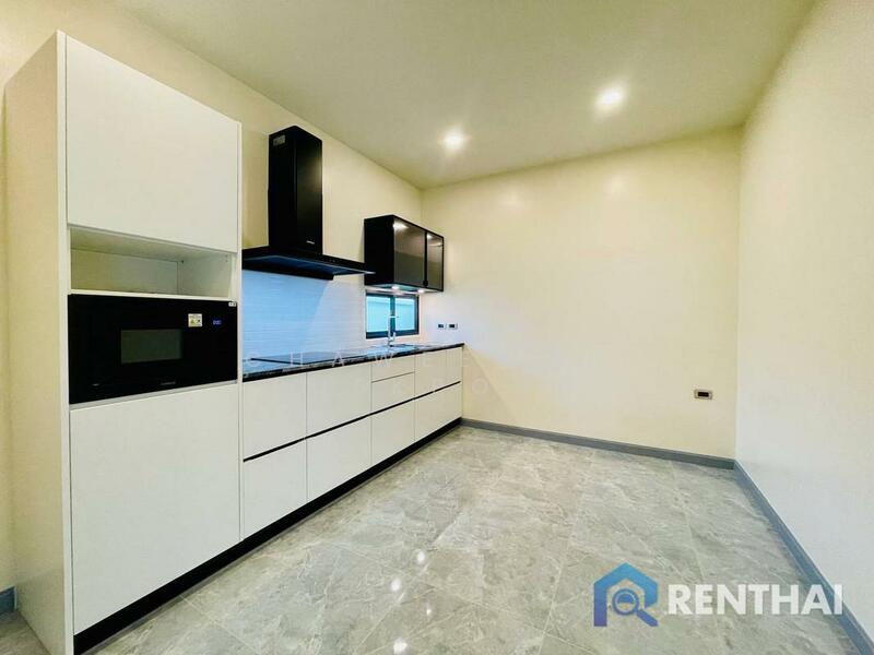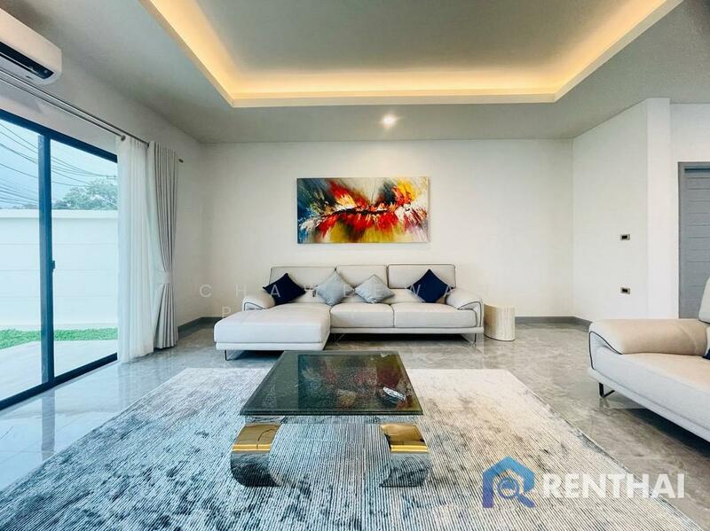 Luxury pool villa modern style for sale 4 bedrooms 5 bathrooms. Master bedroom en-suite entirely fitted out with TOTO brand imported from Japan including modern bath tub. The other 3 bedrooms sanitary wear are all fitted with Cotto & American standard brands 1 guest bathroom 1 laundry room1 storage room. Private swimming pool 3.5x9 m. Modern tiles beautiful garden. European & Thai kitchens made by Kvik company from Denmark .Are roof tiles use SCG company & The roof truss work is guarantee for 5 years.The external walls are to 2.2 meters in height. Garage width 7 meters. Italian leather sofa from Decorum in pattaya, Dining room table & coffe table also from Decorum in pattaya.