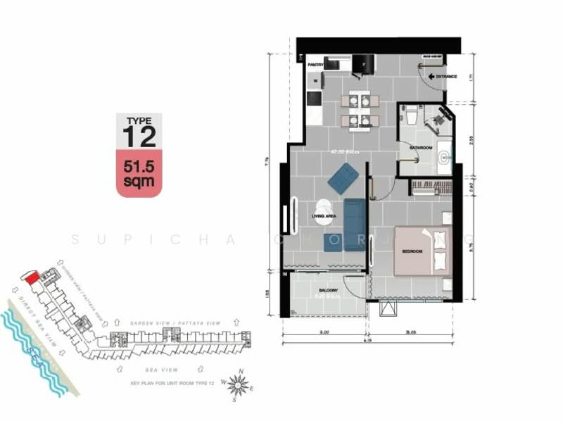 1 bedroom, 1 bathroom condo for sale with a floorsize of 51.5 squaremeters, located on the 11th floor, at Copacabana Coral Reef