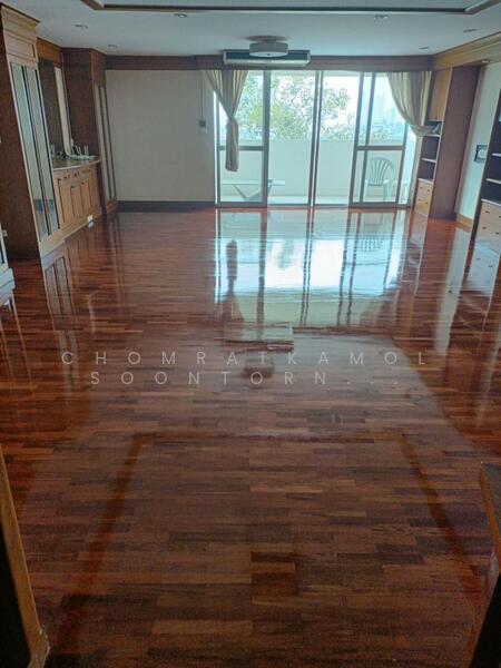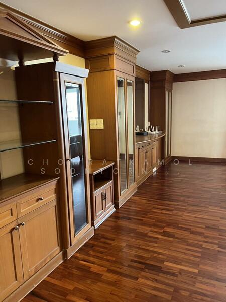 This spacious freehold condo offers 210 square meters of interior space on the 9th floor of D.S. Tower 1 Sukhumvit 33 in Khlong Tan Nuea, Wattana, Bangkok. The residence provides three bedrooms and three bathrooms with a generous open-plan layout. The home suits buyers seeking a large city apartment with warm finishes and practical built-in storage.