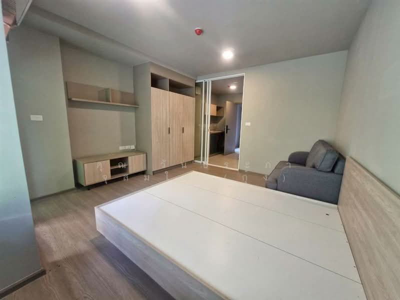 พื้นปูลามิเนต ตกแต่งพร้อมอยู่ มีเตียง ตู้เสื้อผ้า ชั้นวางทีวี ชั้นเก็บรองเท้า บิวท์อินครัว