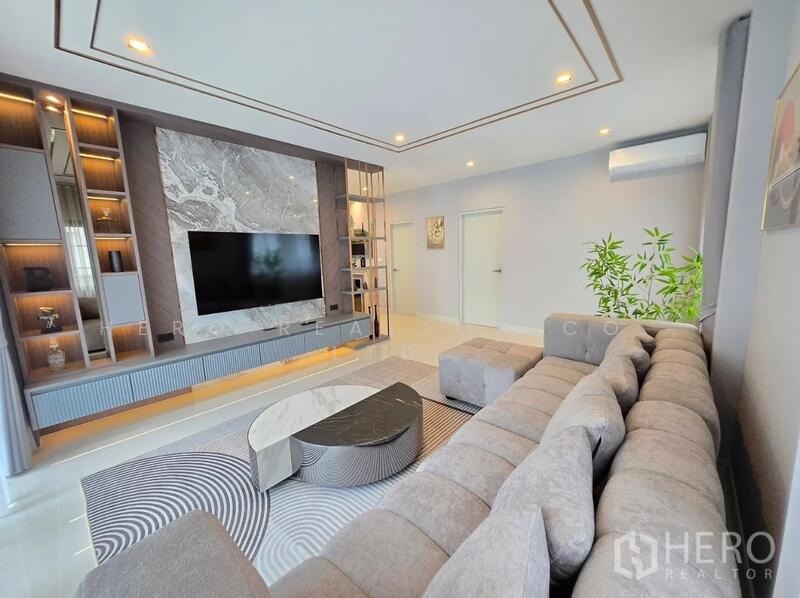 This contemporary 4-bedroom, 5-bath detached house at Centro Bangna offers generous family living in a peaceful and secure neighborhood, just minutes from Mega Bangna and IKEA.