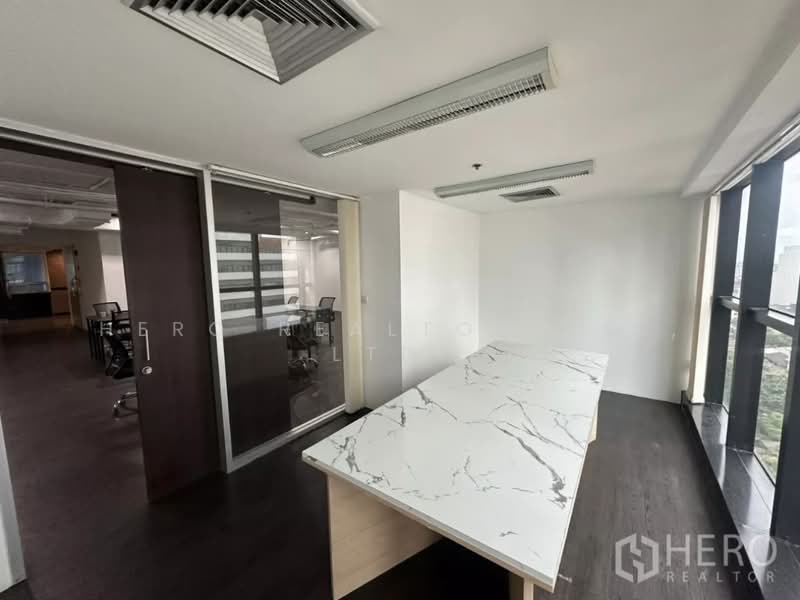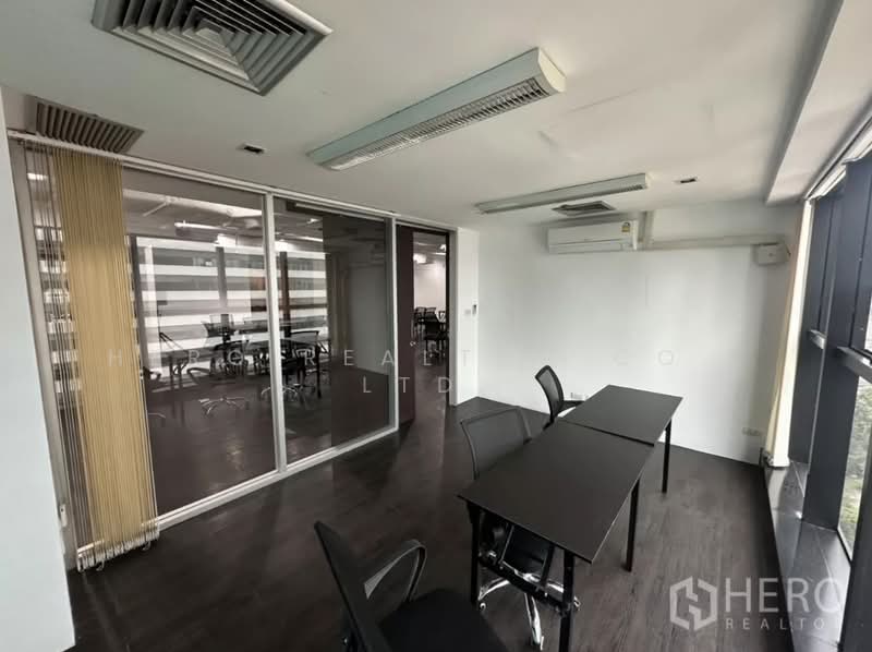 Office space 220 sqm for rent in Watthana near BTS Ekkamai. 3 meeting rooms, open-plan workspace, large windows. 650 THB/sqm (143,000 THB/month).