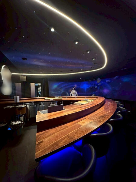 Decoration: Premium wooden counter bar and Rooftop zone with city view suitable for an Outdoor Bar.