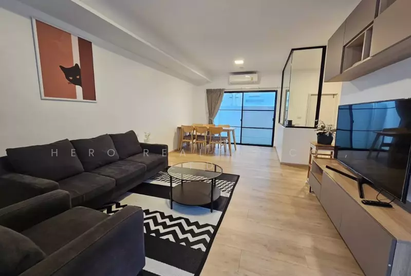 Beautiful and cozy 2-storey townhome for rent in Indy 5 Village, Bangna KM.7. Located near food markets, community facilities, and Mega Bangna, ideal for family living with convenient access to shopping and international schools.