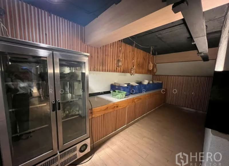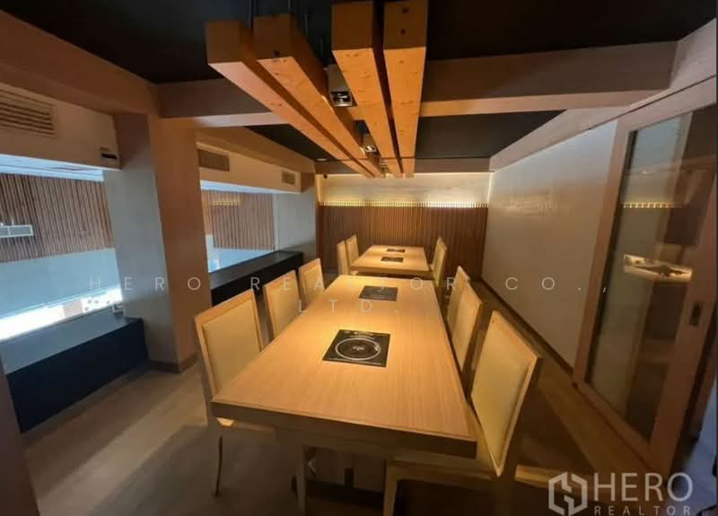 Usable area of 1,400 sq.m. on approximately 70 sq.wah of land, with parking for 10 cars. The building features a full glass frontage, a commercial restaurant kitchen, dining area, private rooms, bathrooms, storage area.