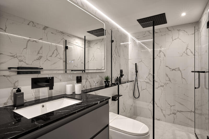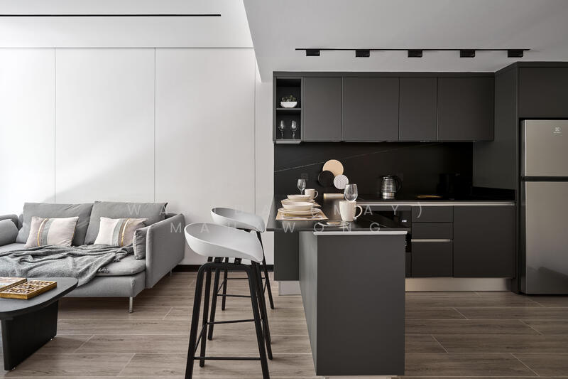 The open-plan layout connects a sleek modern kitchen with bright living and dining areas, enhanced by architectural lighting and quality finishes. Floor-to-ceiling windows bring in natural light, while the private balcony offers a calm retreat. The bedroom is spacious and comfortable, paired with a stylish bathroom featuring marble-effect finishes. Fully furnished and move-in ready.