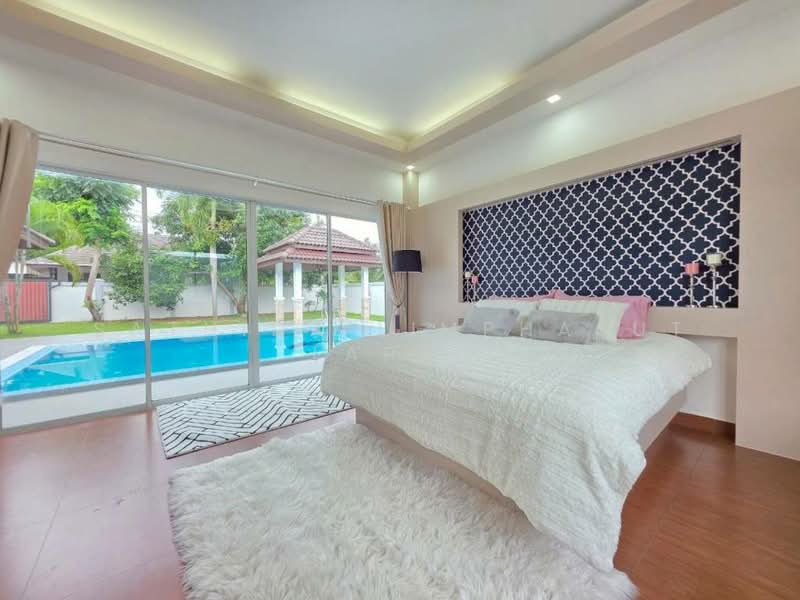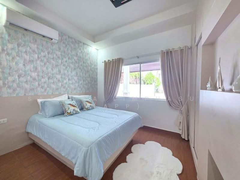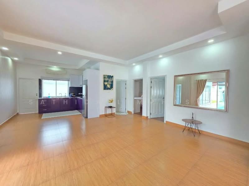 A 3-bedroom, 4-bathroom villa with a private swimming pool and lush garden space, perfect for families or those seeking privacy. The home features modern design with contemporary Thai influences, offering an open and spacious interior with high ceilings and large glass walls that allow natural light to fill the space. The European-style built-in kitchen connects seamlessly to the living and dining areas. Outdoors, a large terrace and poolside lounge area provide a relaxing setting for comfortable living.