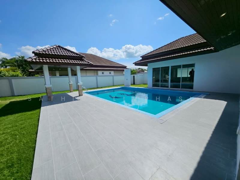 A 3-bedroom, 4-bathroom villa with a private swimming pool and lush garden space, perfect for families or those seeking privacy. The home features modern design with contemporary Thai influences, offering an open and spacious interior with high ceilings and large glass walls that allow natural light to fill the space. The European-style built-in kitchen connects seamlessly to the living and dining areas. Outdoors, a large terrace and poolside lounge area provide a relaxing setting for comfortable living.