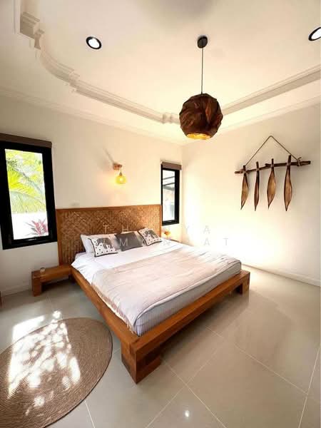 From the moment you arrive, the villa’s distinctive Thai character stands out—graceful rooflines, rich wood accents, and an inviting layout that flows naturally between indoor and outdoor spaces. The open-plan living area is bright and breezy, offering a perfect setting for relaxation or entertaining. A well-equipped kitchen complements the space, while each bedroom has been thoughtfully designed for comfort and privacy, featuring natural materials and calming tones.
