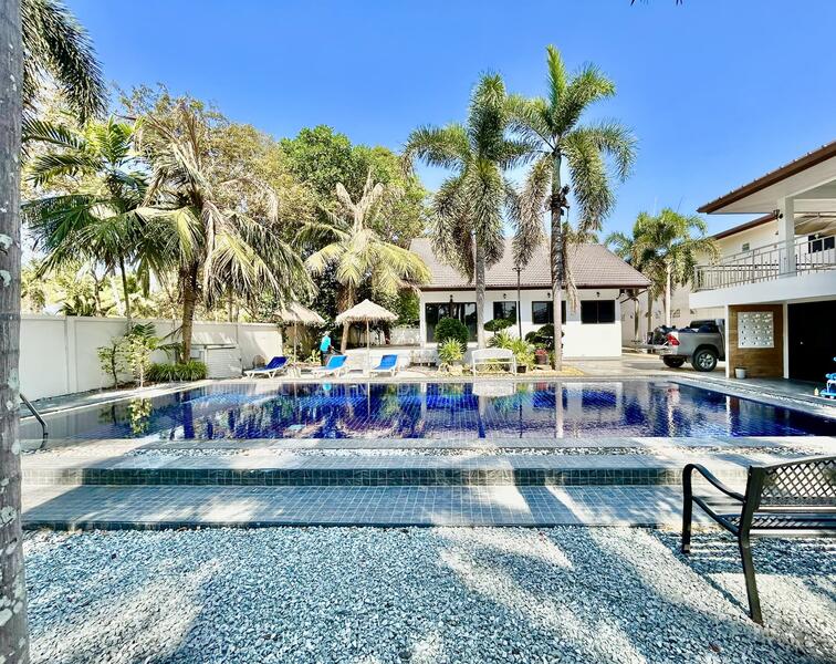 House for Rent in Huay Yai, Pattaya. Offering 4 Bedrooms 6 Bathrooms in total of both Houses. Sitting on 1,240 Sqm of land plot size. Indulge in a luxurious retreat featuring a spacious 6×12-meter saltwater pool, a dedicated karaoke room with dazzling disco lights, and a gourmet kitchen fully equipped for culinary adventures. Enjoy friendly competition with a pool table, air hockey table, and goal table, enjoying the convenience of instant hot water in every room and Free Wi-Fi.