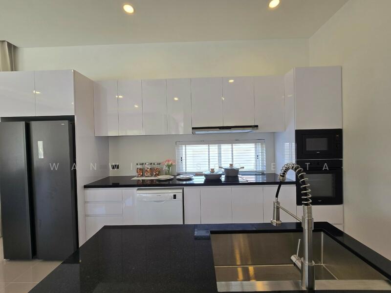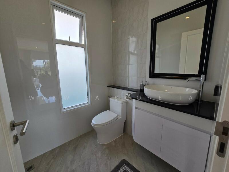 This modern pool villa offers 3+1 bedrooms and 3 bathrooms on a land area of 200 sq.wah (800 sqm) with a living area of 250 sqm. The villa is fully furnished and ready to move in. The open-plan living and dining area features high ceilings, creating a bright and spacious atmosphere.