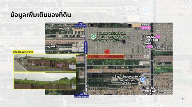 - หน้ากว้าง ติดถนนข้าวหลาม และติดทางเข้าคลอง 3 โดยประมาณ 90 เมตร