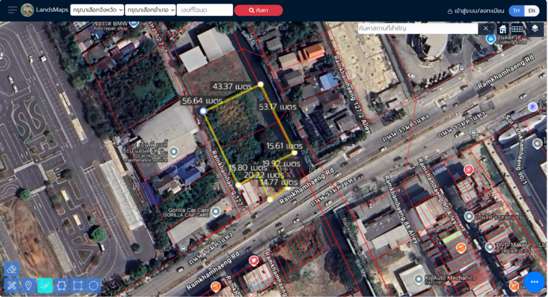 - Land on Ramkhamhaeng Road, the entrance to the land on the main road is 15 meters wide, 19 meters deep, the main plot of land is 43 meters wide, 57 meters deep.
