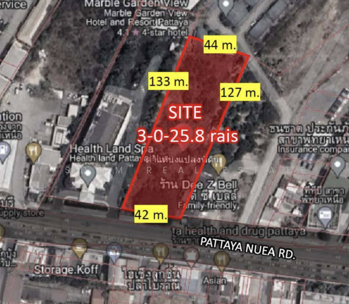 Land for sale, 3 rai, on Pattaya North Road, near Health Land and Terminal 21.