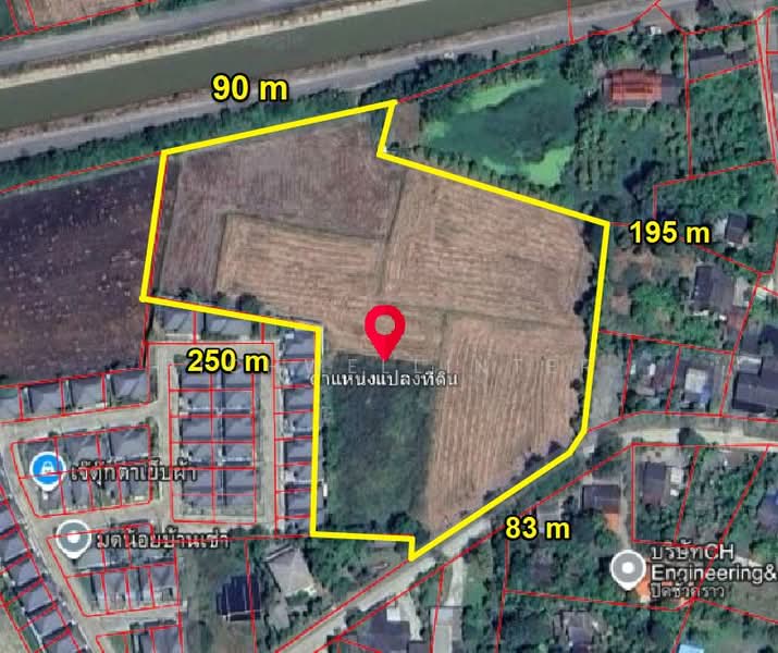 Land for sale in Hua Samrong, 11 rai, with frontage on two roads, including a road along the canal near Wat Ao Chang Lai, 7 km from Gateway Industrial Estate, Plang Yao District, Chachoengsao.
