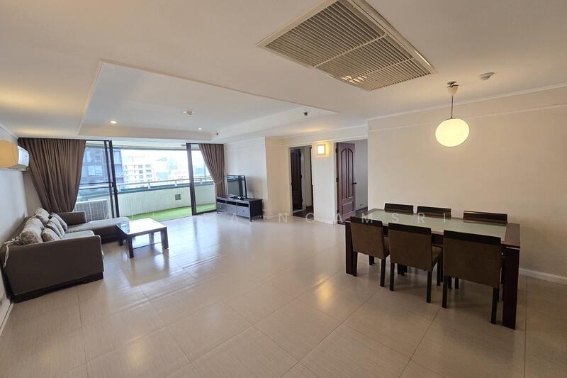 This spacious 141.90 sqm condo is located on a high floor and offers a generous living area, a compact kitchen equipped with an oven, a guest toilet, a washing machine, and a balcony with views towards Celes Asoke / Sukhumvit 21.