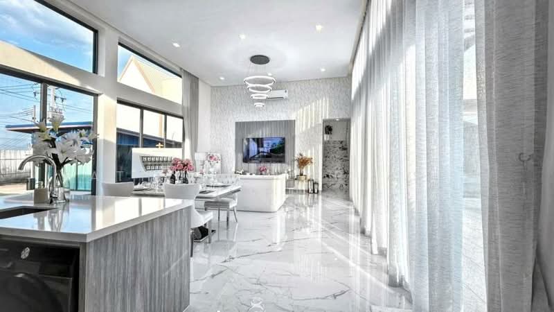 พื้นที่ภายในตกแต่งด้วยวัสดุคุณภาพสูง เช่น พื้นหินอ่อนและเพดานสูงที่เพิ่มความรู้สึกโปร่งและโอ่อ่า ห้องนั่งเล่นที่มีแสงธรรมชาติเข้าถึง มีหน้าต่างบานใหญ่และการแบ่งพื้นที่แบบเปิดให้เป็นส่วนที่คุณจะรู้สึกสบาย ห้องครัวโมเดิร์นประกอบด้วยเคาน์เตอร์หินอ่อน, ตู้เก็บของสีขาวมีการจัดเป็นระเบียบ พร้อมทั้งเตาอบและเตาไฟฟ้าที่ทันสมัย