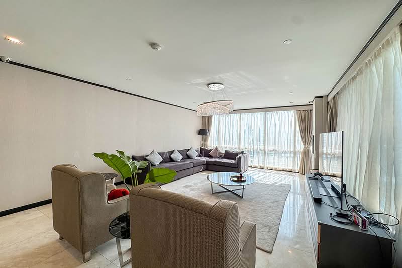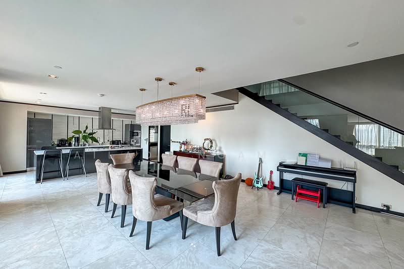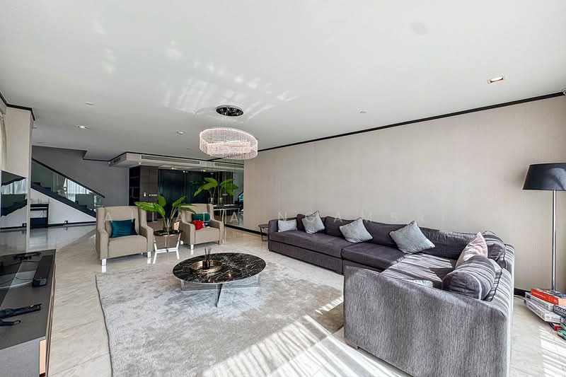 The duplex features a spacious living room overlooking the private swimming pool, two kitchens, a maid's quarter, a separate lounge area, and three bedrooms, each with its own en-suite bathroom.