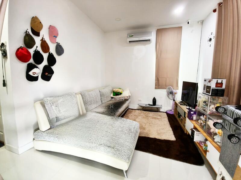 บ้านมีประตูบานเลื่อนมุ้งจีบ พื้นที่นั่งเล่นหน้าบ้าน พื้นที่ข้างบ้านทำสวนหย่อมได้