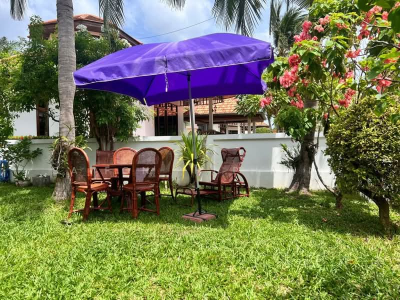 The villa delivers strong benefits through its private garden, covered outdoor areas, and practical layout. A spacious covered terrace with wooden outdoor seating overlooks the lush lawn and tropical plants. The walled garden includes hedges for privacy, mature trees, palm plants, flowering shrubs, and paved walkways. Multiple outdoor dining and lounging zones with tables, chairs, sun lounge