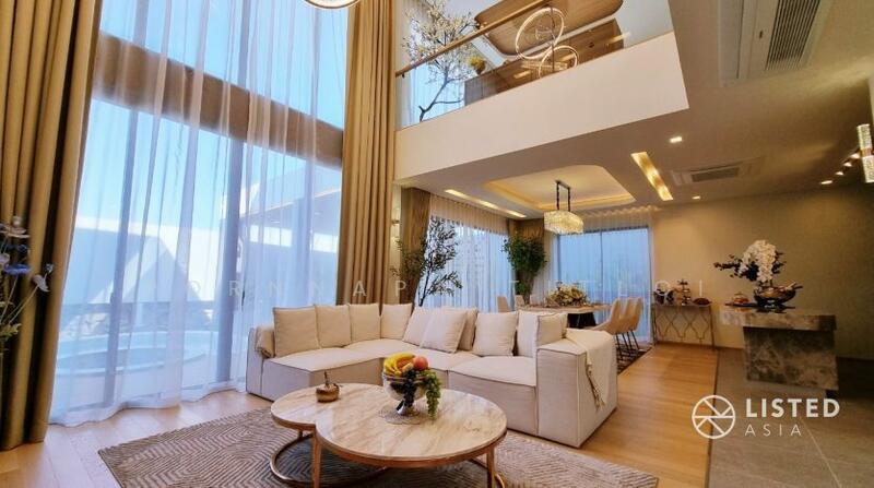 Pool Villa boasts a spacious 520 Sqm of useable area and sits on a 472 Sqm of land plot size. It offers 5 bedrooms, 7 bathrooms, and a maid’s room. The property includes two expansive open-plan living areas with soaring ceilings and sliding glass doors, providing stunning views of the pool and garden. The layout also features a dining area, a modern European kitchen, a separate Thai kitchen, and a convenient guest restroom. The master bedroom features an expansive walk-in closet, a luxurious jacuzzi, dual sinks, and a glass-enclosed shower. Additionally, the house includes three balconies.