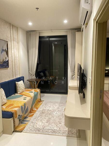 This stylish 1-bedroom condo offers a smart 37 sqm layout on the 25th floor of Maru Ladprao 15 in Chomphon, Chatuchak, Bangkok. The home presents a modern open-plan design with a cozy living area, contemporary kitchen, comfortable bedroom, and sleek bathroom. A private balcony extends the living space and showcases an impressive city view.