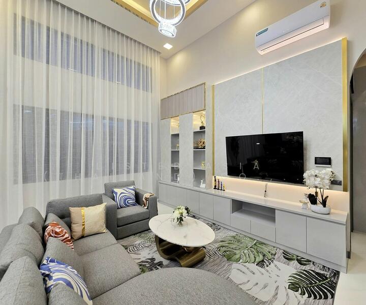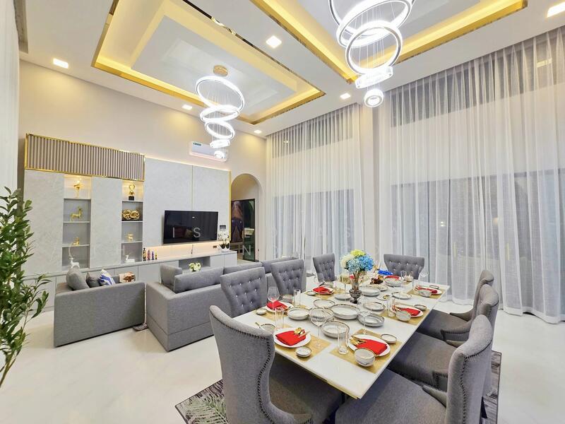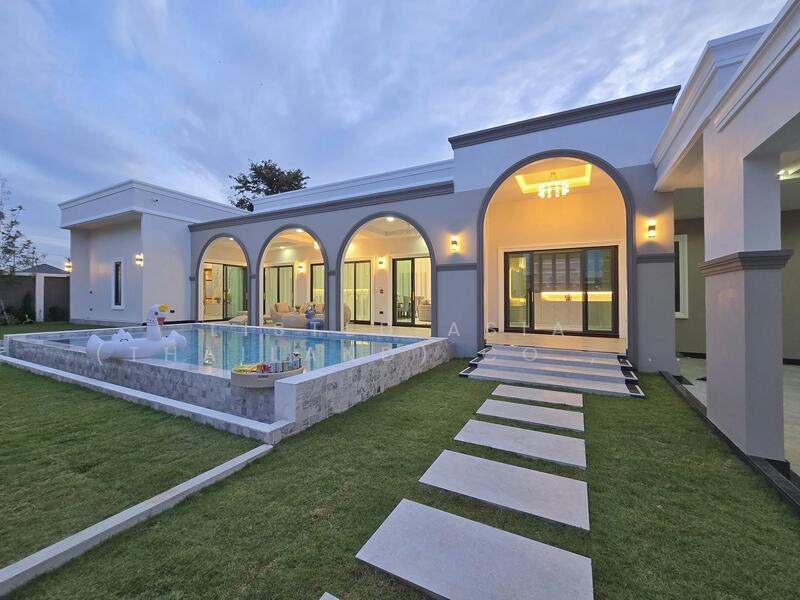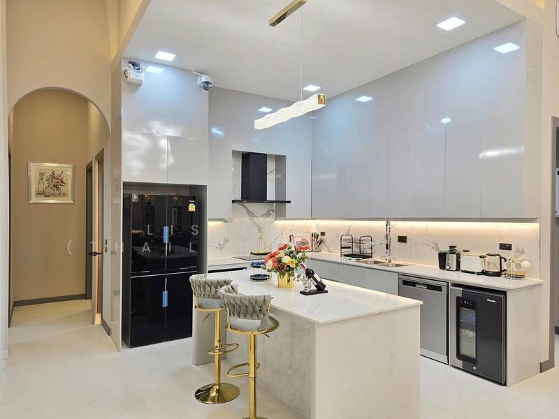 Modern Pool Villa 4 Beds for Sale in East Pattaya – This stunning luxury pool villa offers an expansive 307.75 sqm of living space, designed for comfort and modern living. Featuring 4 bedrooms and 5 bathrooms, this home boasts a high-ceiling living area that creates an open and airy atmosphere. The villa is fully furnished with premium furniture and appliances, including a European kitchen with a stylish kitchen island, as well as a separate Thai kitchen for added convenience.