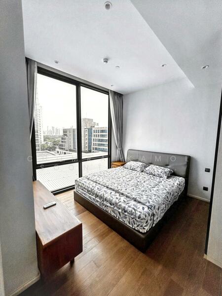 The bedroom is a serene retreat with a double bed, large window, and contemporary neutral color scheme. Enjoy the same breathtaking city views while basking in the natural light that floods the room.