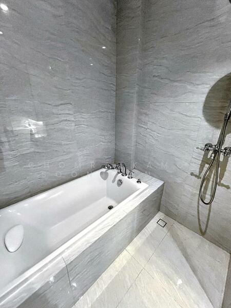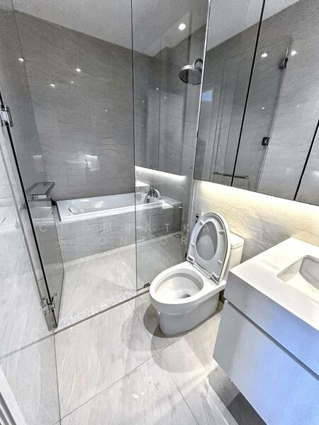 The bathroom is a haven of modern design, equipped with a glass shower enclosure, bathtub, and chic fixtures, including a chrome faucet set and under-cabinet lighting. The space is accentuated with floor-to-ceiling tiles, contributing to its sleek ambiance.