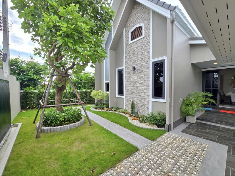 Offers a warm and homely atmosphere with a modern design. The villa features high ceilings and brand-new furniture, combining comfort and functionality to create an ideal home for families. Set on 103 square wah of land, the property includes a private swimming pool measuring 8×3 meters, three bedrooms and four bathrooms, a European kitchen with island and a separate Thai kitchen. Every room is fitted with built-in furniture and the home is fully furnished with quality electrical appliances. Surrounding the villa is a spacious lawn and garden, while secure parking for two cars is available within the property. Located in Pong Klang Soi, Mabprachan, Pattaya, the project sits directly on the main road for convenient access and benefits from a 7-Eleven store right in front of the development. With no common fees, this home is perfectly suited for comfortable long-term living.