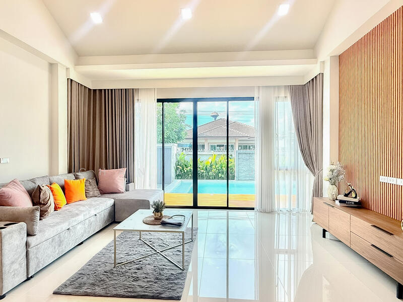 This freestanding single-story pool villa is newly built and move-in ready, ideal for personal living, a holiday home, or investment. Located in the peaceful Soi Nam Mao area of Huai Yai, the property offers a perfect balance of comfort, privacy, and accessibility.
