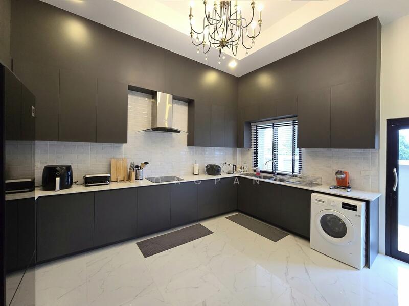 The villa features five bedrooms, six bathrooms, two living areas with pool views, a high-ceiling main hall, and a private office. A European kitchen with a kitchen island and built-in counters complements the home’s modern style. Designed for both comfort and functionality, the villa also comes with an energy-saving solar cell system, a landscaped front garden, and high-quality finishes throughout.