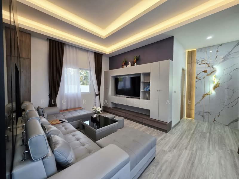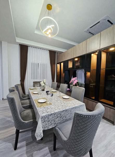 The house offers 260 square meters of living space on 102 square wah of land. The layout includes four bedrooms and four bathrooms, designed for comfortable family living. Furthermore, the spacious living area connects directly to the pool terrace and landscaped garden, creating a bright and open atmosphere. Consequently, the design supports both relaxation and entertaining.