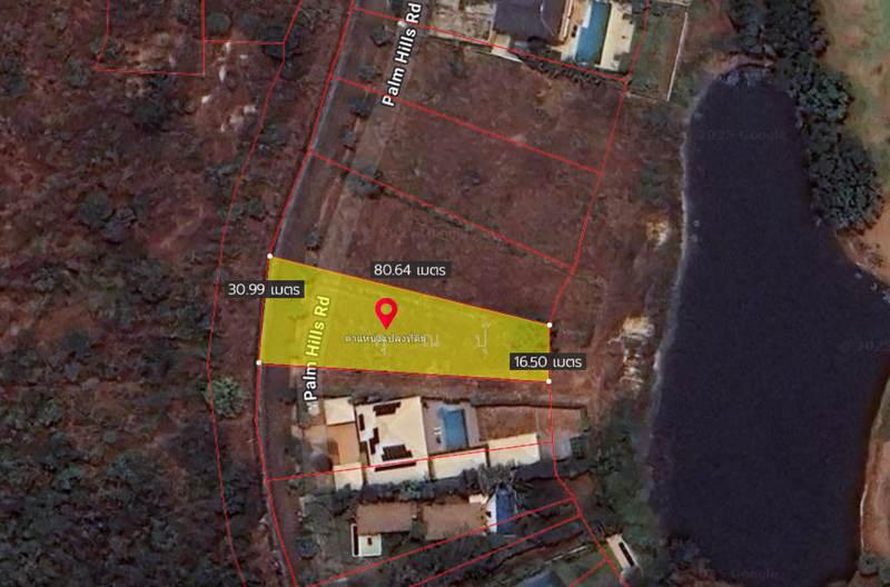 ขายที่ดินเปล่าที่ดินในหมู่บ้านปาล์มฮิลส์กอล์ฟคลับ แอนด์ เรสซิเดนส์ อำเภอชะอำ เพชรบุรี เนื้อที่ 1 ไร่ 1 งาน l กว้าง 32 เมตร l ลึก 80 เมตร l หันหน้าไปทางทิศตะวันตกเฉียงเหนือ